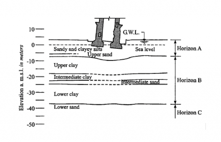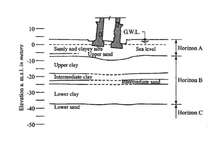 Assim, a Torre de Pisa possui uma estrutura de 56.4m de altura, oito andares, totalizando um peso 14.800 toneladas, que em 1890 apresentava uma inclinação de 5.5°. Em 1990, o governo italiano criou um comitê para estabilizar a Torre, já que a mesma estava na eminência de ruptura, nesta mesma data a Torre de Pisa foi interditada sendo reaberta para visitações em 2001. Depois deste passeio pelo passado fica mais fácil de entender porque a Torre de Pisa tem esse formato, assim…Um dos grandes motivos da Torre de Pisa ser inclinada, é a escolha da fundação, a torre de 56.4m (equivalente a um prédio de 20 andares) possui fundação por sapata rasa assente em uma camada com menos de três metros de profundidade, além disso, o solo abaixo da fundação é extremamente fraco, perfil do solo apresentado na Figura 1 retrata uma camada de aproximadamente 40m de argila de baixa resistência. Certamente, no final da construção da primeira etapa, o solo não se tratava mais de um solo pré-adensado, mas sim de um solo normalmente adensado, ou seja, a argila carrega uma “memória de carregamento” de modo que quando a carga aplicada é superior a qualquer carregamento aplicado em toda história do solo, ele tende a adensar (deformar de modo que o número de vazios do solo diminua).Este fenômeno ocorre de forma similar a um pistão hidráulico: imaginemos que uma carga é aplicada em um pistão, o mesmo tende a resistir estes carregamentos momentaneamente, entretanto com o passar do tempo a pressão da água é dissipada, ocasionando grandes deformações. Note que o fenômeno conhecido como adensamento (muito comum nos solos da região de Pelotas, por possuírem altas quantidades de argilas) pode ser entendido como as deformações que ocorrem por dissipação de poropressão no solo e é a ocorrência do adensamento que possibilitou a Torre de Pisa estar inclinada, mas não entrar em ruptura.