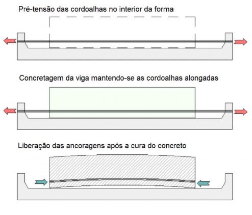 O pré-tensionamento é muito utilizado em peças pré-fabricadas e necessita de uma pista de fundição. Nesse sistema, os cabos são colocado na pista e tracionados por um macaco hidráulico, posteriormente é feita a concretagem das formas. Após a cura do concreto, as ancoragens extremas são destravadas, causando a protensão da peça. Vale ressaltar que neste sistema de protensão há aderência entre a barra de aço e o concreto. Na Figura 4 você pode conferir a ilustração das etapas desse processo.