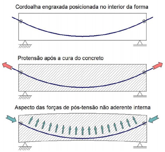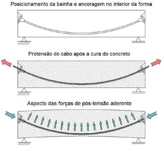 A pós-tração por aderência são instaladas bainhas metálicas corrugadas no interior das formas, normalmente os cabos de protensão apresentam uma trajetória sinuosa no interior das bainhas, assim, após a concretagem e cura do concreto, é feito o tracionamento dos cabos e injeção de nata de concreto dentro das bainhas. Este método garante que a força de protensão seja transmitida do cabo para o concreto através do atrito. A Figura 5 apresenta as etapas deste processo.