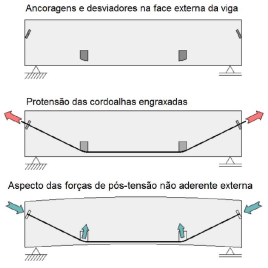 Para a pró-tensão não aderente externa, primeiramente devem ser instalados desviadores na face da peça de concreto por onde serão passados os cabos de protensão. Esse método é muito utilizado para o recorço de vigas. A Figura 7 apresenta as etapas desse processo.