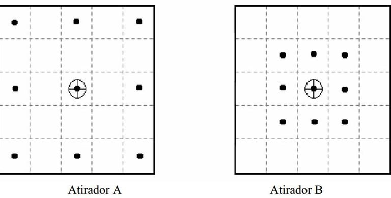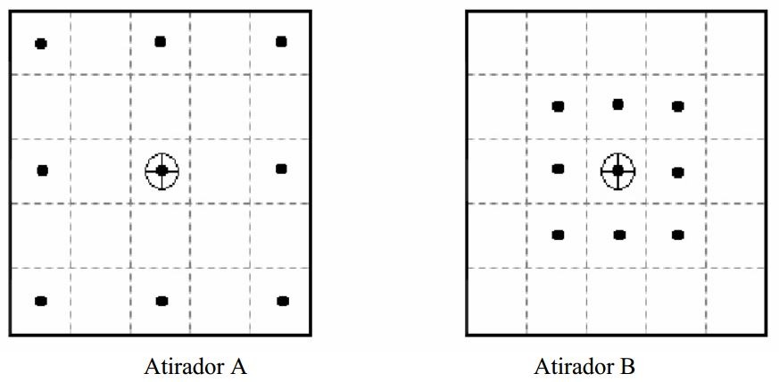 Analisando a primeira imagem, a média dos resultados do atirador A coincide exatamente com o centro do alvo, assim como o atirador B, entretanto, o atirador B possui menor dispersão (melhor precisão) que o atirador A.
