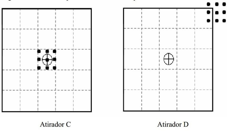 Essa comparação mesmo esclarecida parece um pouco confusa, portanto, vamos utilizar duas ilustrações visuais coo exemplo para ficar mais claro. Observe os atiradores A, B, C e D nas duas imagens a seguir: