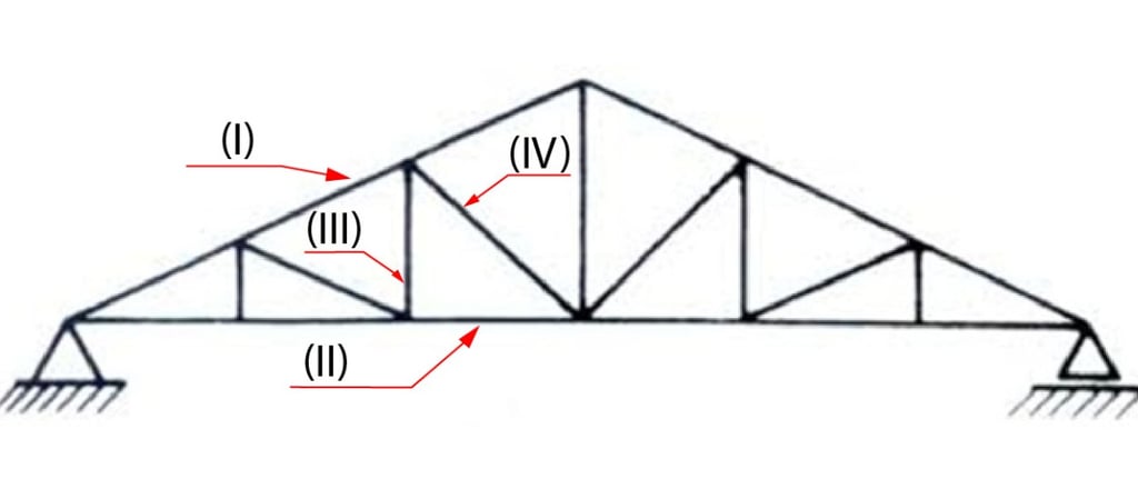Elas são capazes de sustentar as cargas permanentes e variáveis atuantes nas estruturas, como por exemplo o vento. São compostas pelas Empenas (I) e Linhas (II), Montantes ou pendurais (III), diagonais (IV) e nós. As empenas e as diagonais sofrem esforços de compressão, enquanto os montantes e linhas são tracionados.